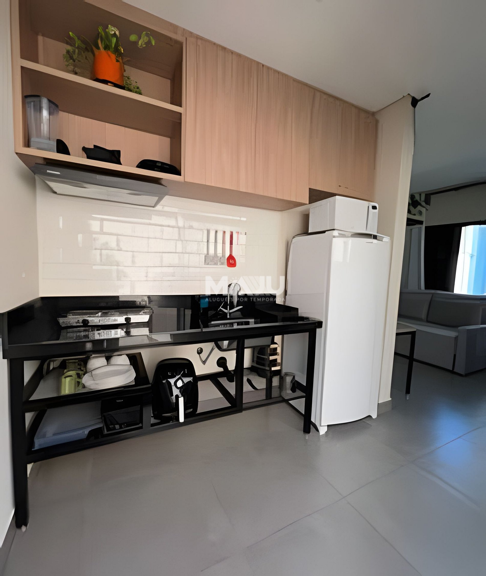 - Cozinha/lavanderia: armário planejado, fogão elétrico de 2 bocas, geladeira, filtro anexado à torneira, microondas, sanduicheira, liquidificador, air fryer, utensílios básicos (copos, pratos, talheres e panelas), tanque e máquina de lavar para até 8,5 kg.