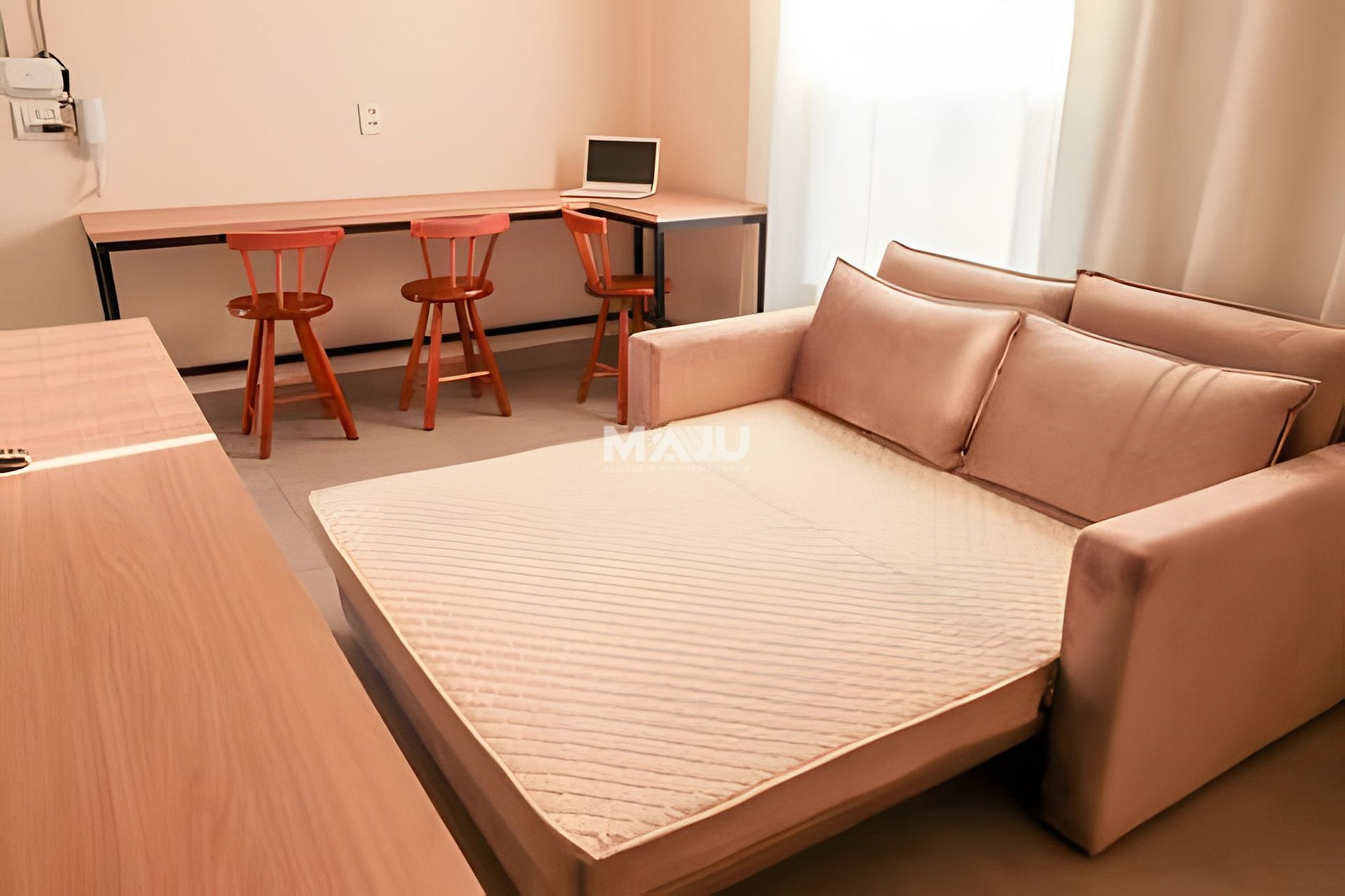 - Sala: 1 sofá-cama para casal, mesa com cadeiras (para home office e refeições), Smart TV (com antena local e canais gratuitos Samsung), ventilador e roteador de internet Wi-Fi.