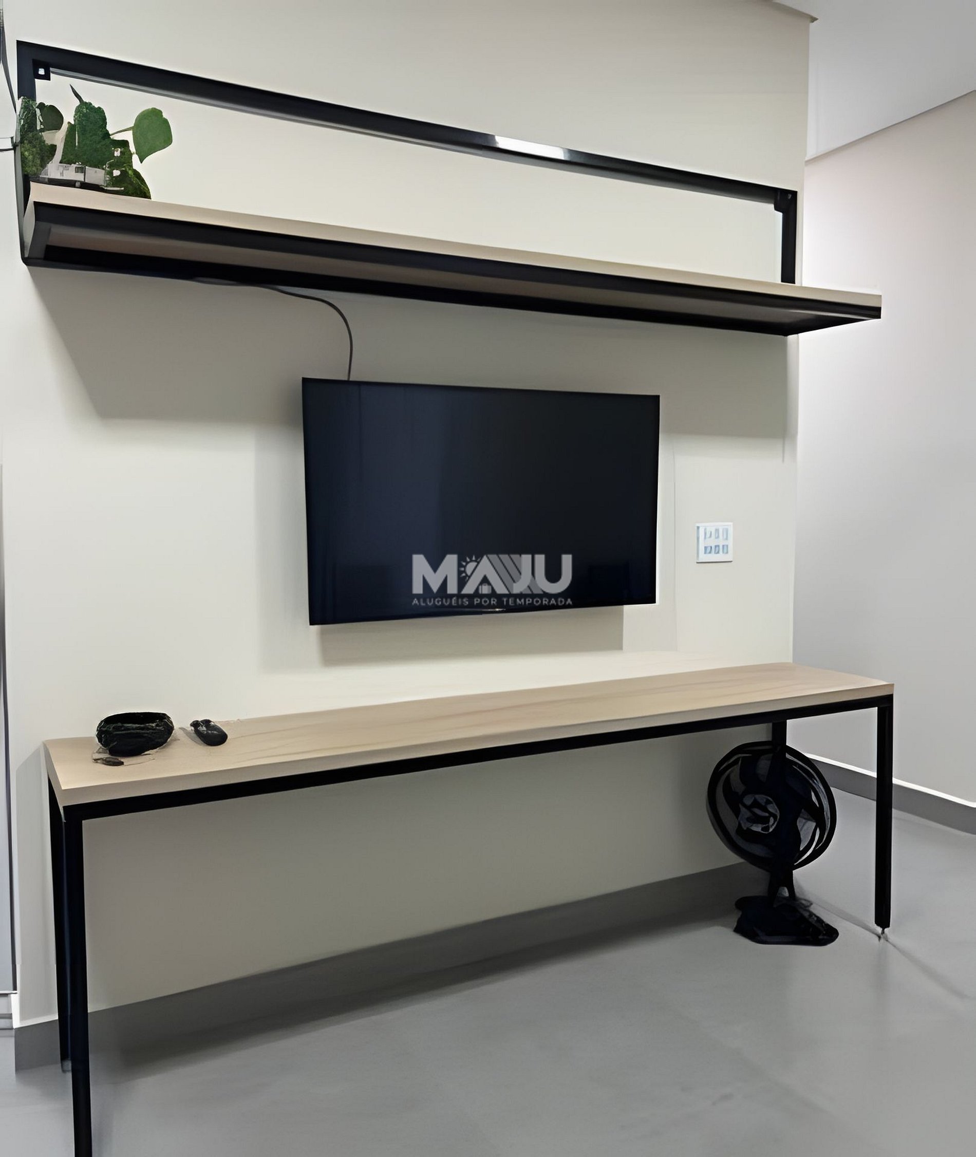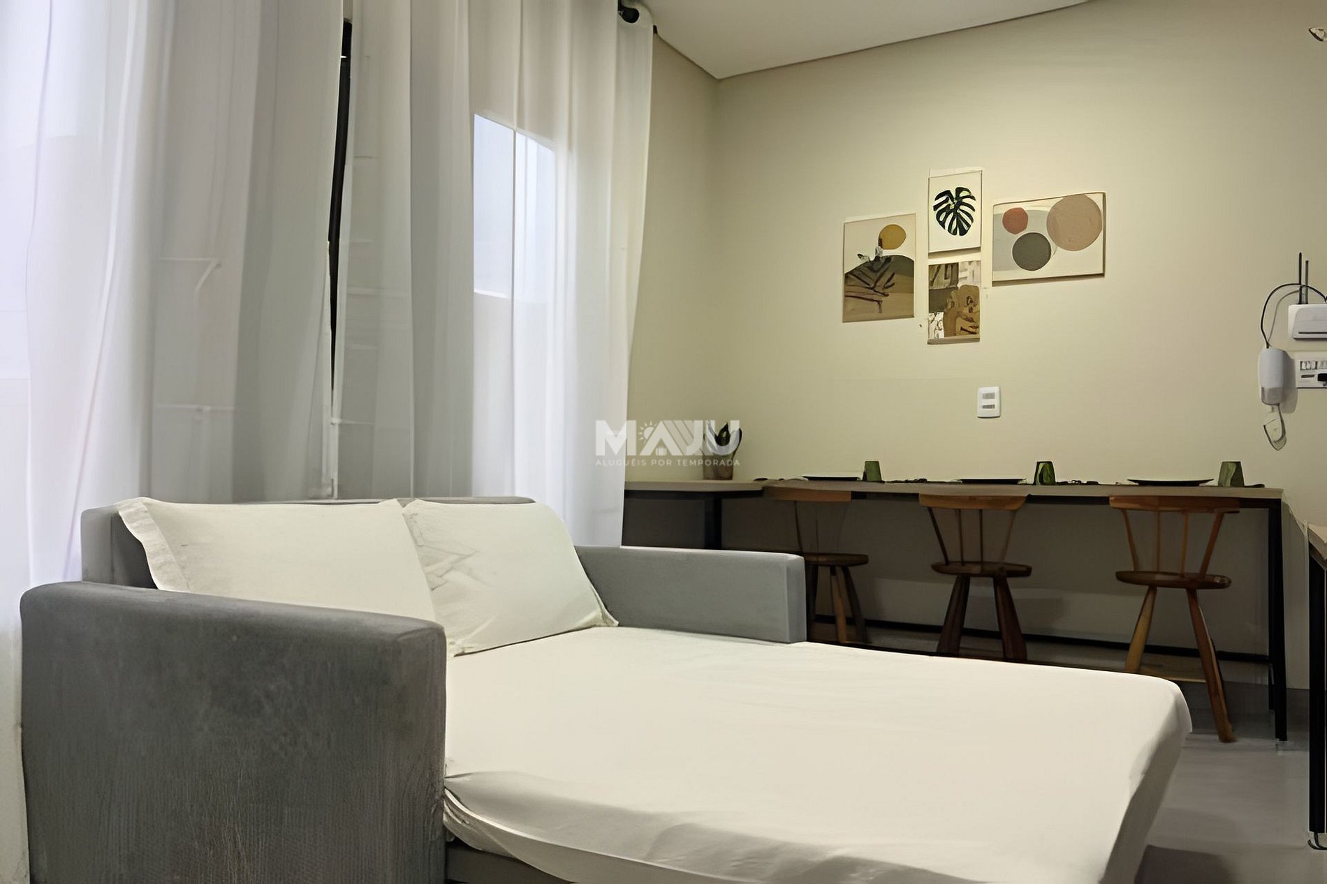 - Sala: 1 sofá-cama para casal, mesa com cadeiras (para home office e refeições), Smart TV (com antena local e canais gratuitos Samsung), ventilador e roteador de internet Wi-Fi.