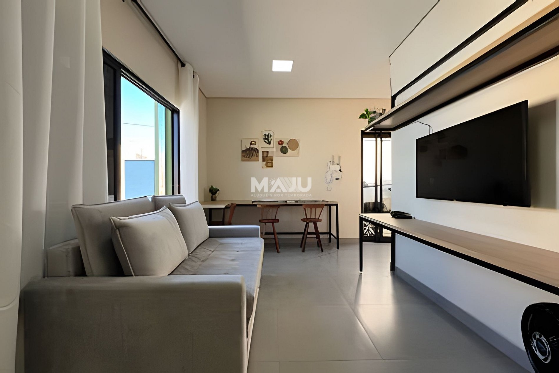 - Sala: 1 sofá-cama para casal, mesa com cadeiras (para home office e refeições), Smart TV (com antena local e canais gratuitos Samsung), ventilador e roteador de internet Wi-Fi.