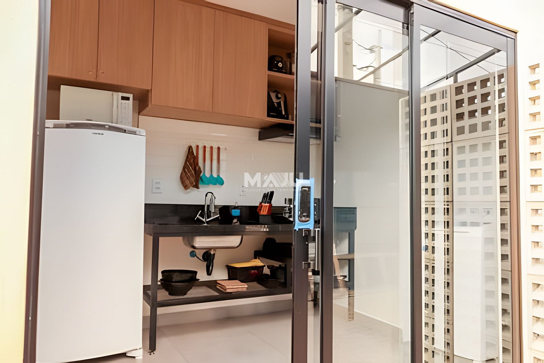 - Cozinha/lavanderia: armário planejado, fogão elétrico de 2 bocas, geladeira, filtro anexado à torneira, micro-ondas, sanduicheira, liquidificador, air fryer, utensílios básicos (copos, pratos, talheres e panelas), tanque e máquina de lavar para até 8,5 kg.