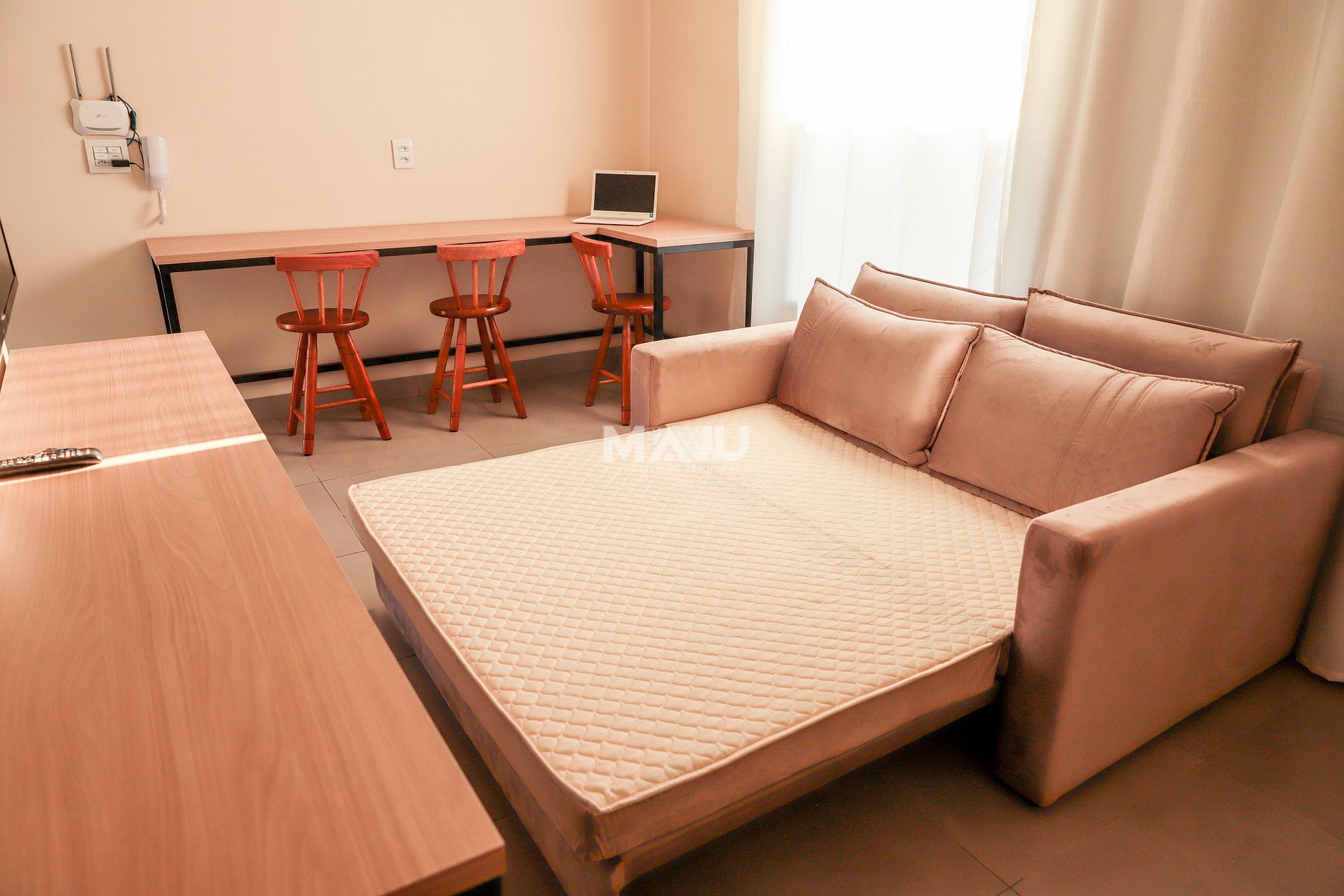 - Sala: 1 sofá-cama para casal, mesa com cadeiras (para home office e refeições), Smart TV (com antena local e canais gratuitos Samsung), ventilador e roteador de internet Wi-Fi.