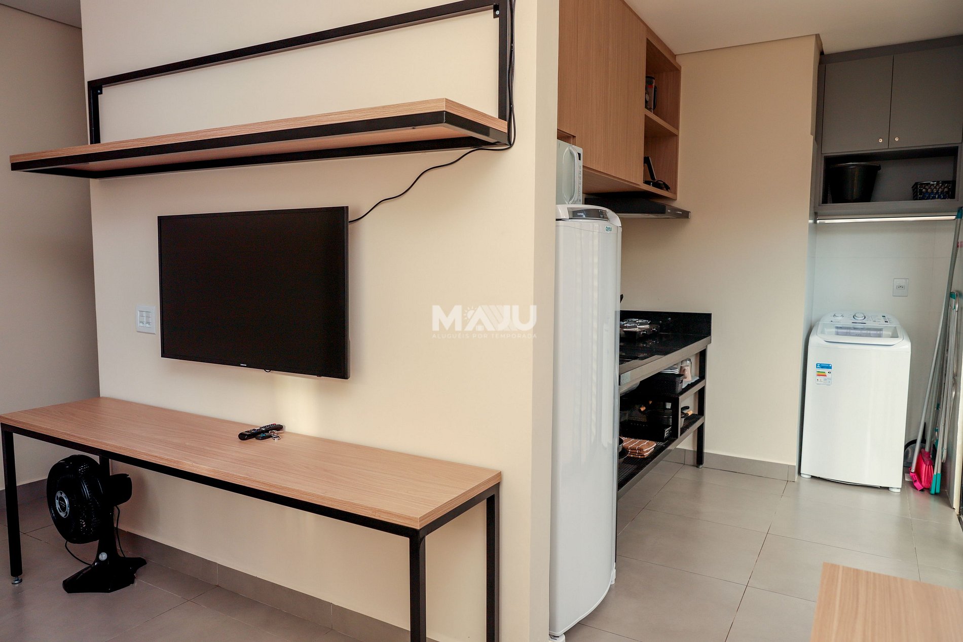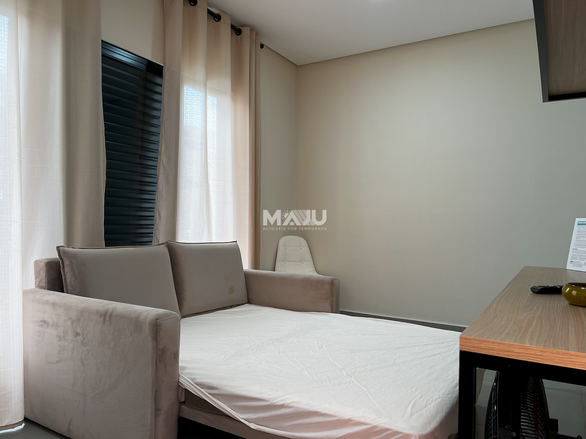 - Sala: 1 sofá-cama para casal, mesa com cadeiras (para home office e refeições), Smart TV (com antena local e canais gratuitos Samsung), ventilador e roteador de internet Wi-Fi.