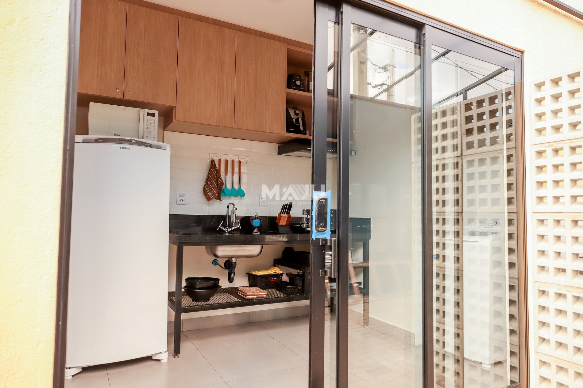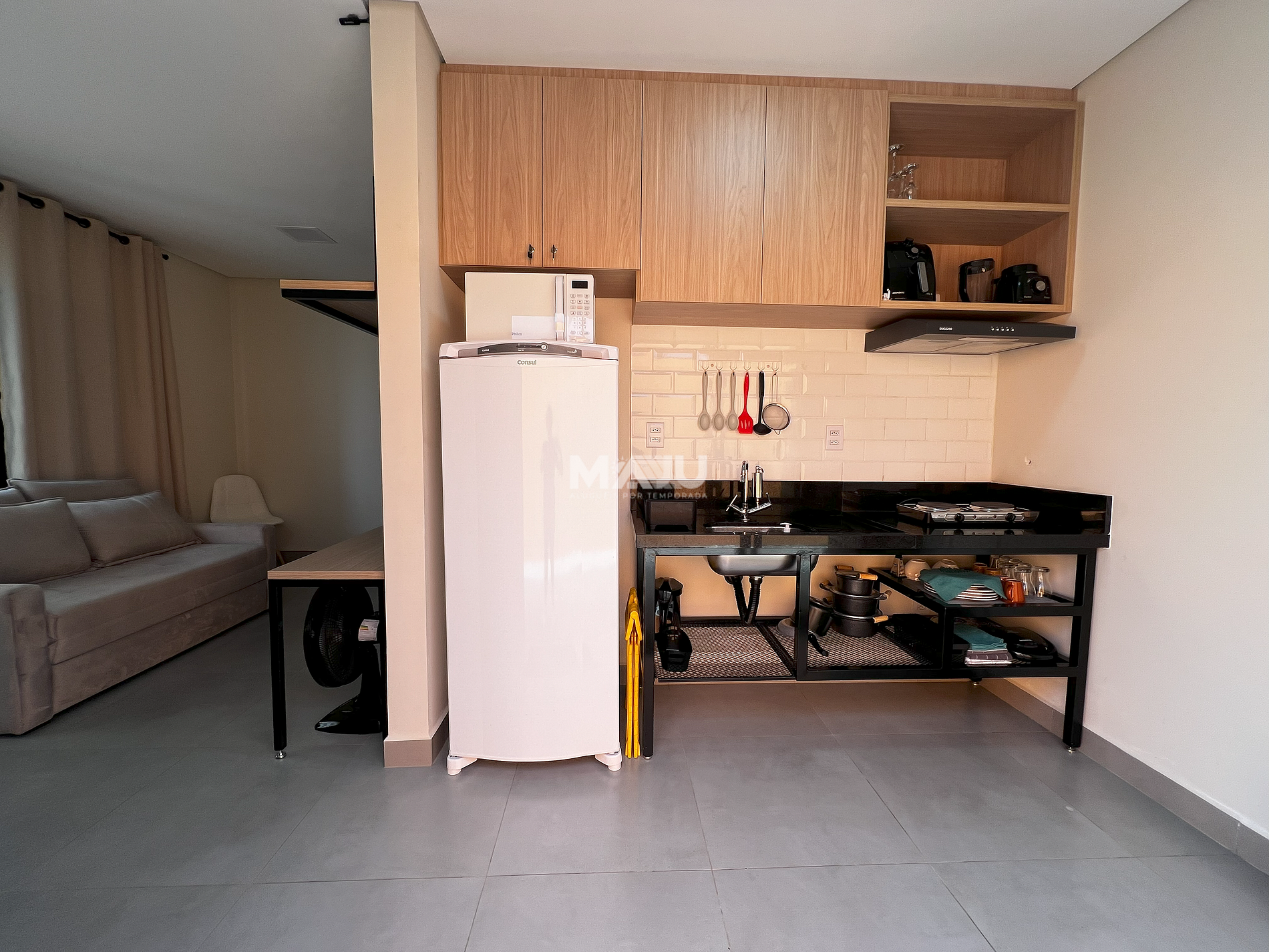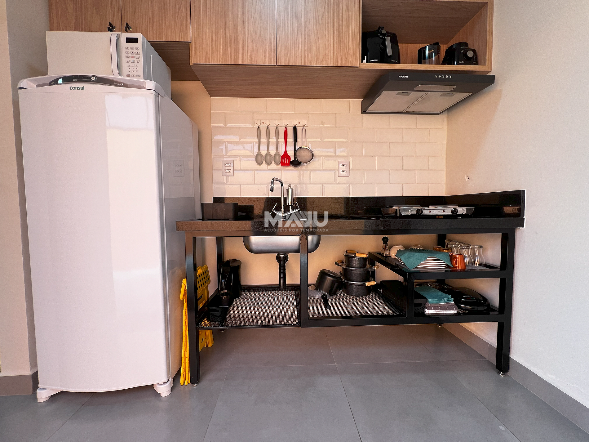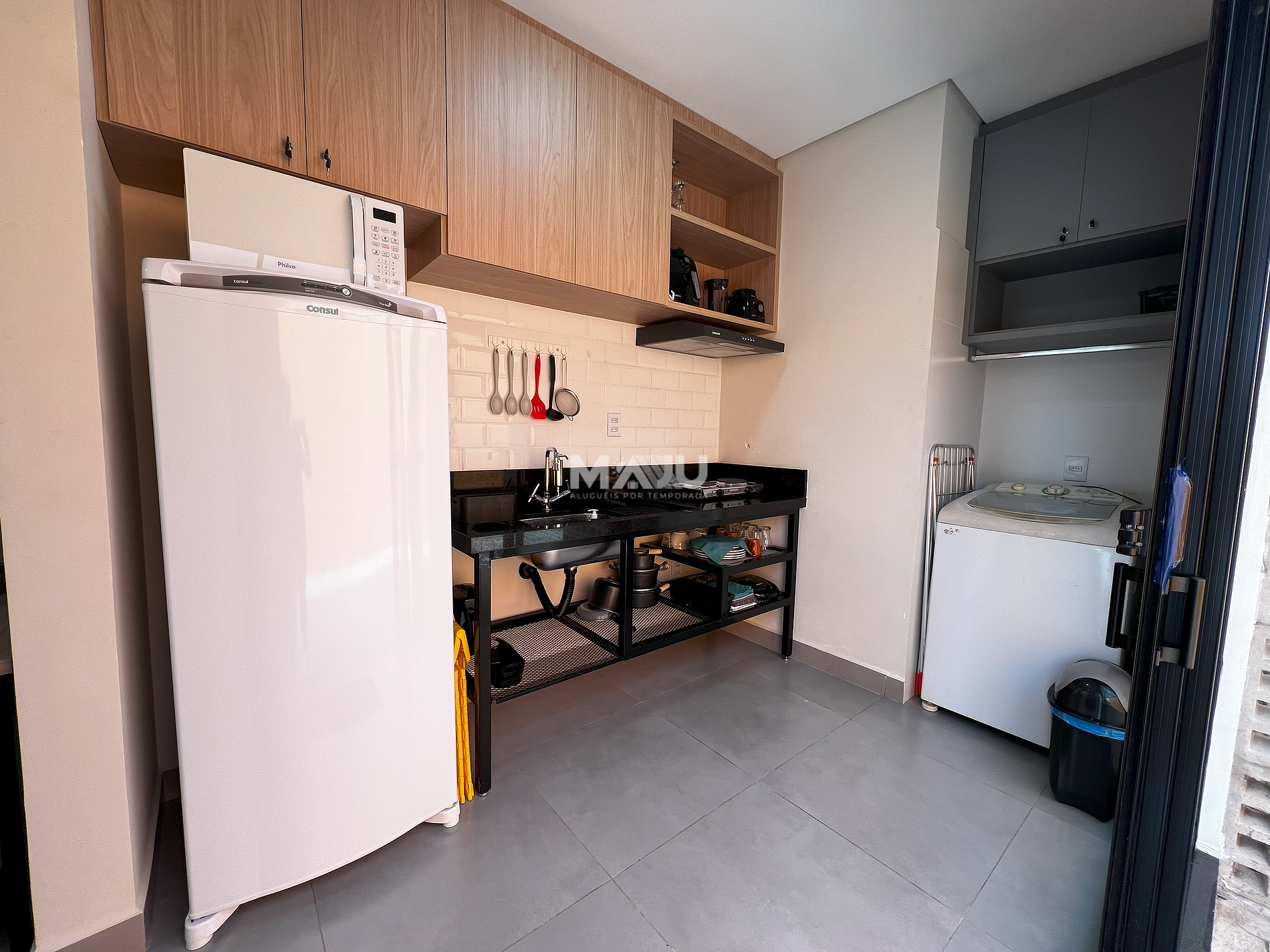 - Cozinha/lavanderia: armário planejado, fogão elétrico de 2 bocas, geladeira, filtro anexado à torneira, microondas, sanduicheira, liquidificador, air fryer, utensílios básicos (copos, pratos, talheres e panelas), tanque e máquina de lavar para até 8,5 kg.